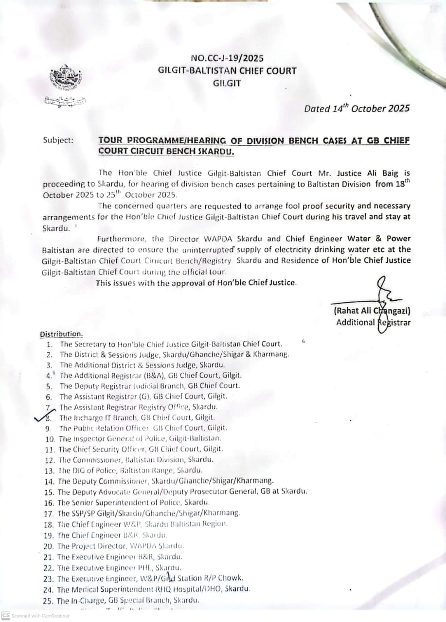 The Honorable Chief Justice GB Tour to Hear Division Bench Cases at Skardu Circuit Bench14 Oct 2025The Honourable Chief Justice Gilgit-Baltistan Chief Court, Mr Justice Ali Baig, is proceeding to Skardu, for the hearing of division bench cases about the Baltistan Division from 18th October 2025 to 25th October 2025.View
