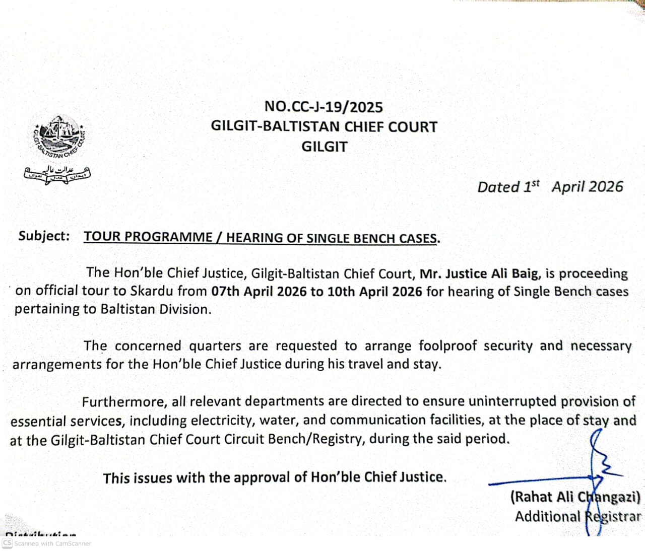Chief Justice Justice Ali Baig to Hear Single Bench Cases During Skardu Tour (April 7–10, 2026)01 Apr 2026The Gilgit-Baltistan Chief Court has announced that Hon’ble Chief Justice Justice Ali Baig will undertake an official visit to Skardu from 7th to 10th April 2026 to hear Single Bench cases related to the Baltistan Division. Find the attached doc.View